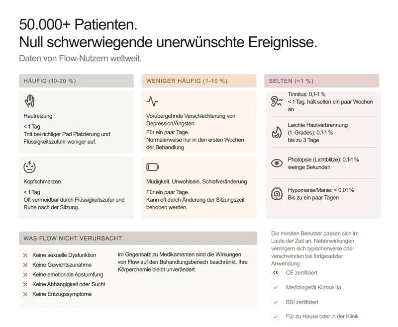 Mehr als 55.000 Menschen in ganz Europa nutzen bereits das Flow-Headset. Die meisten Anwender berichten von positiven Ergebnissen nach 3 Wochen; 77 % sehen eine Verbesserung ihres Depressions-Scores um mindestens 3 Punkte. Es wurden keine ernsten Nebenwirkungen berichtet. Zu den leichten Nebenwirkungen zählen Hautreizungen und Kopfschmerzen.